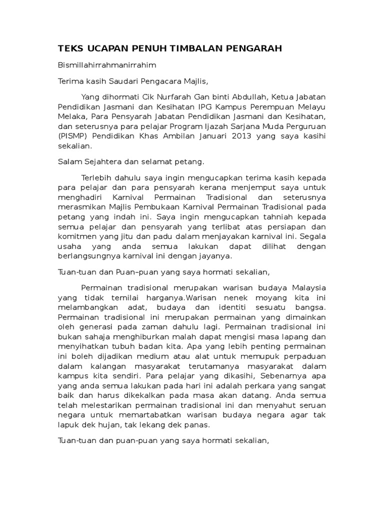 Teks Ucapan Perasmian Karnival Per Tradisional Oleh Tim Pengarah Ipgkrm Docx