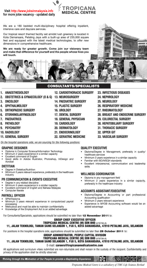 Jawatan Kosong Tropicana Medical Centre November 2011