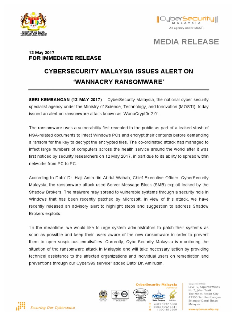 Cybersecurity Malaysia Issues Alert On Wannacry Ransomware Ransomware Malware